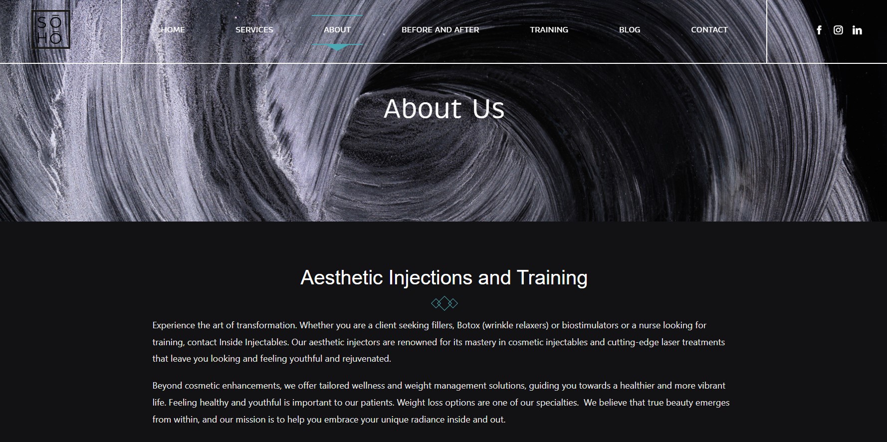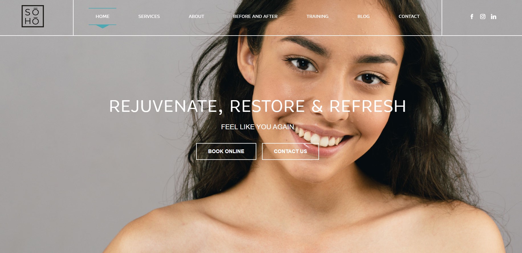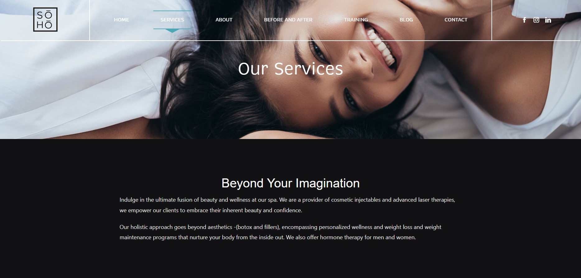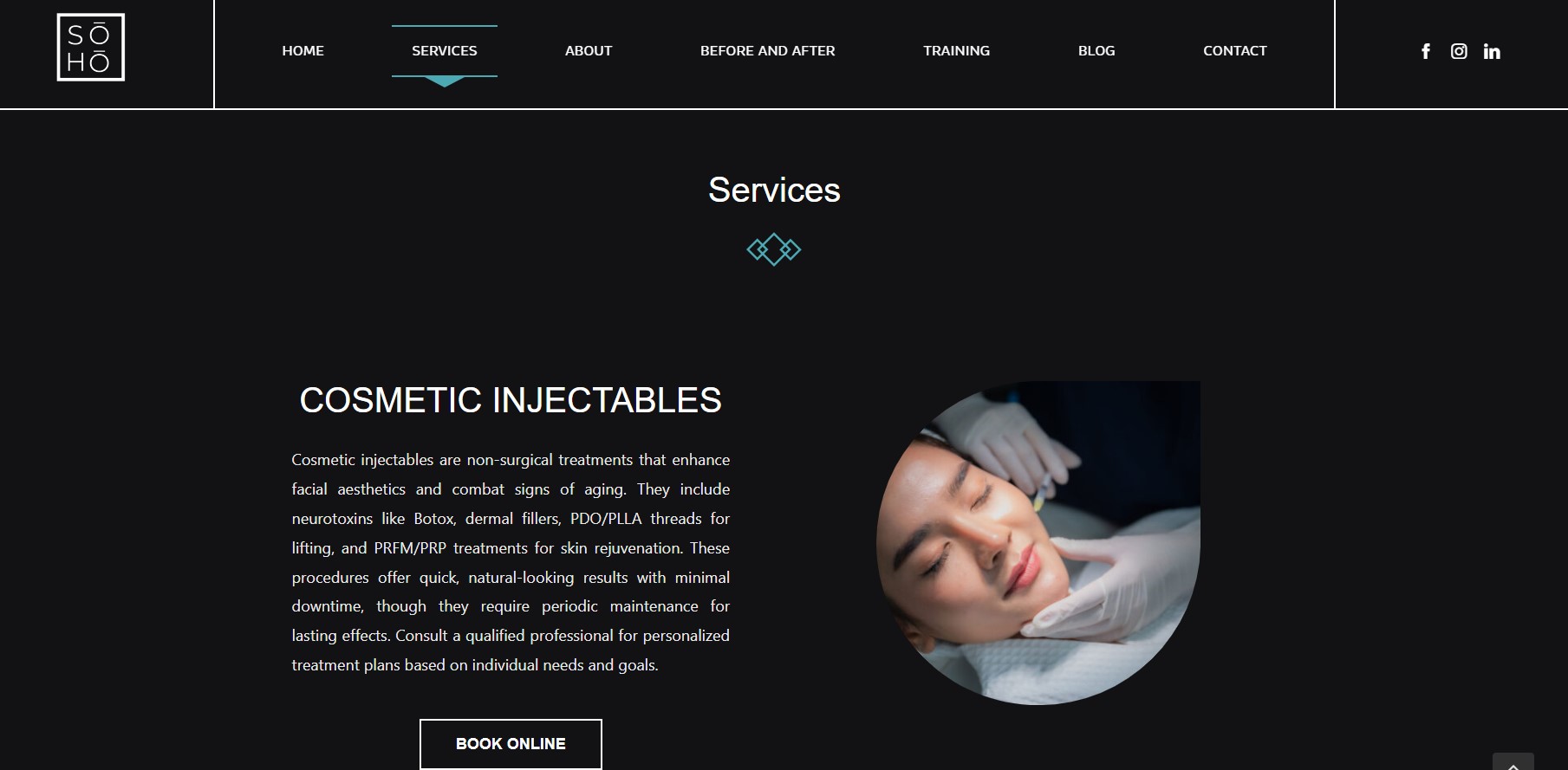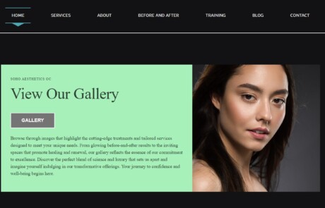 Soho Aesthetics OC is a premier beauty and holistic wellness medical spa. As the leading authority in cosmetic injectables, advanced laser therapies, and body contouring, our skilled practitioners are dedicated to enhancing your appearance and overall well-being. The website includes a Home page, Services page, About page, Before and After page, Blog, and Contact Form. It also features a button that redirects to a booking form.