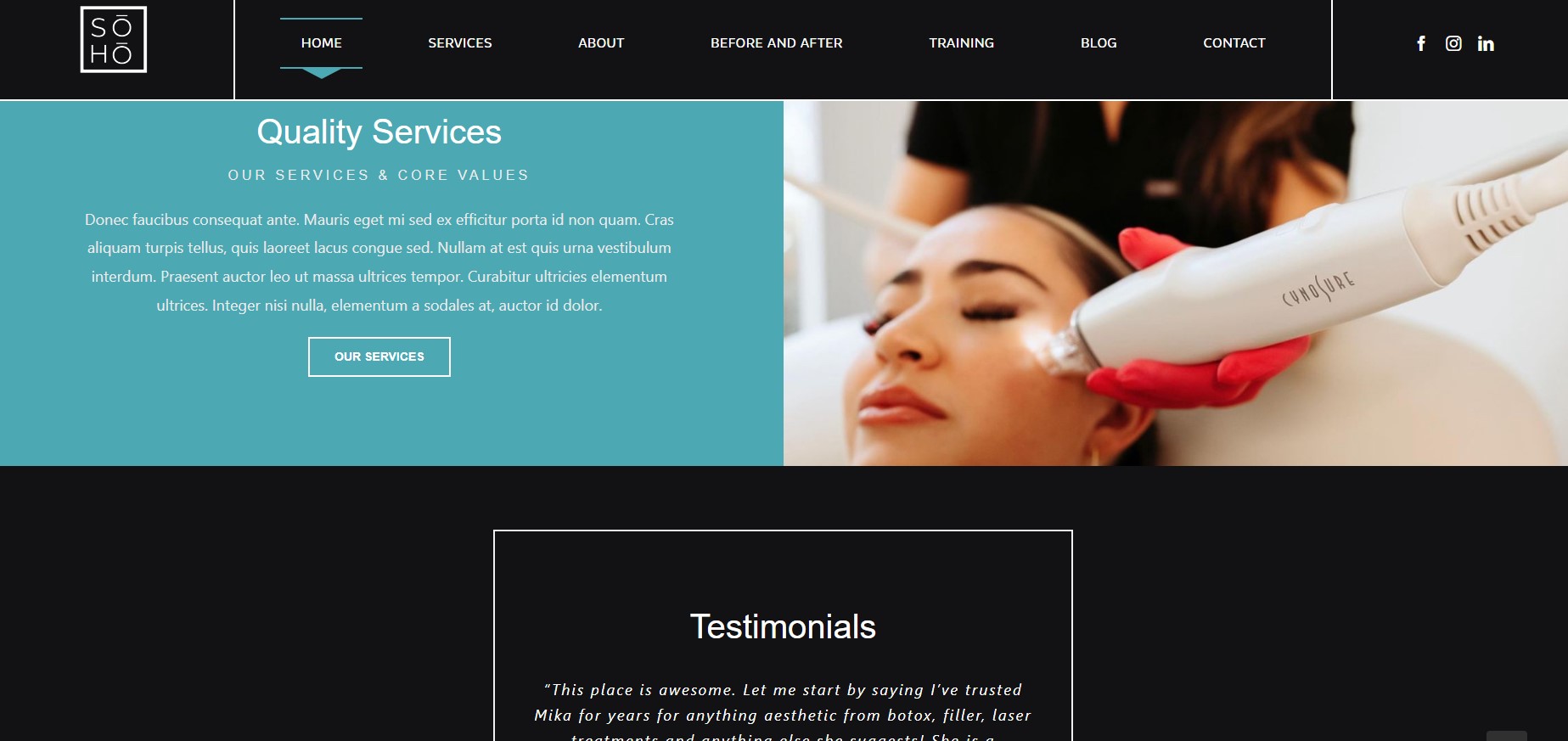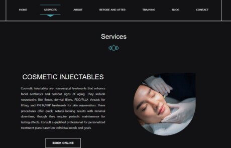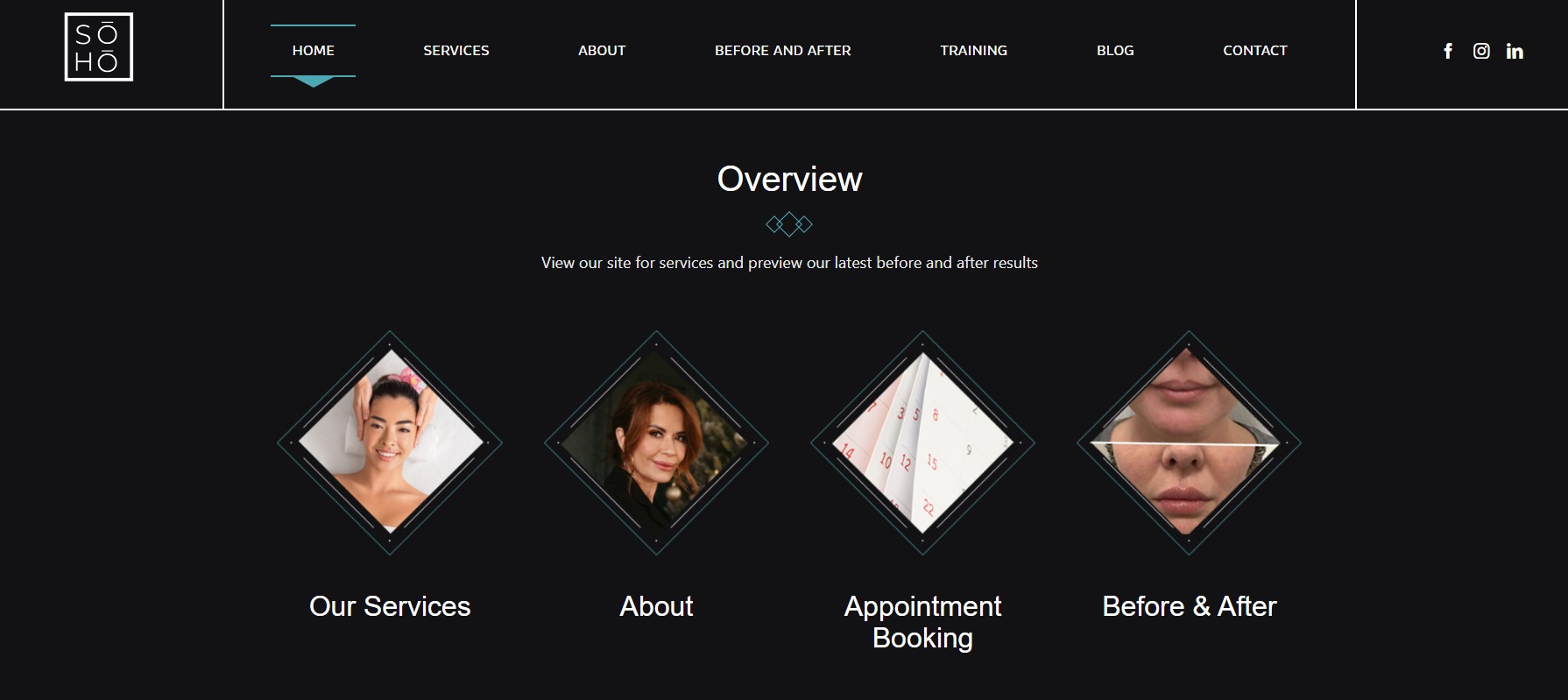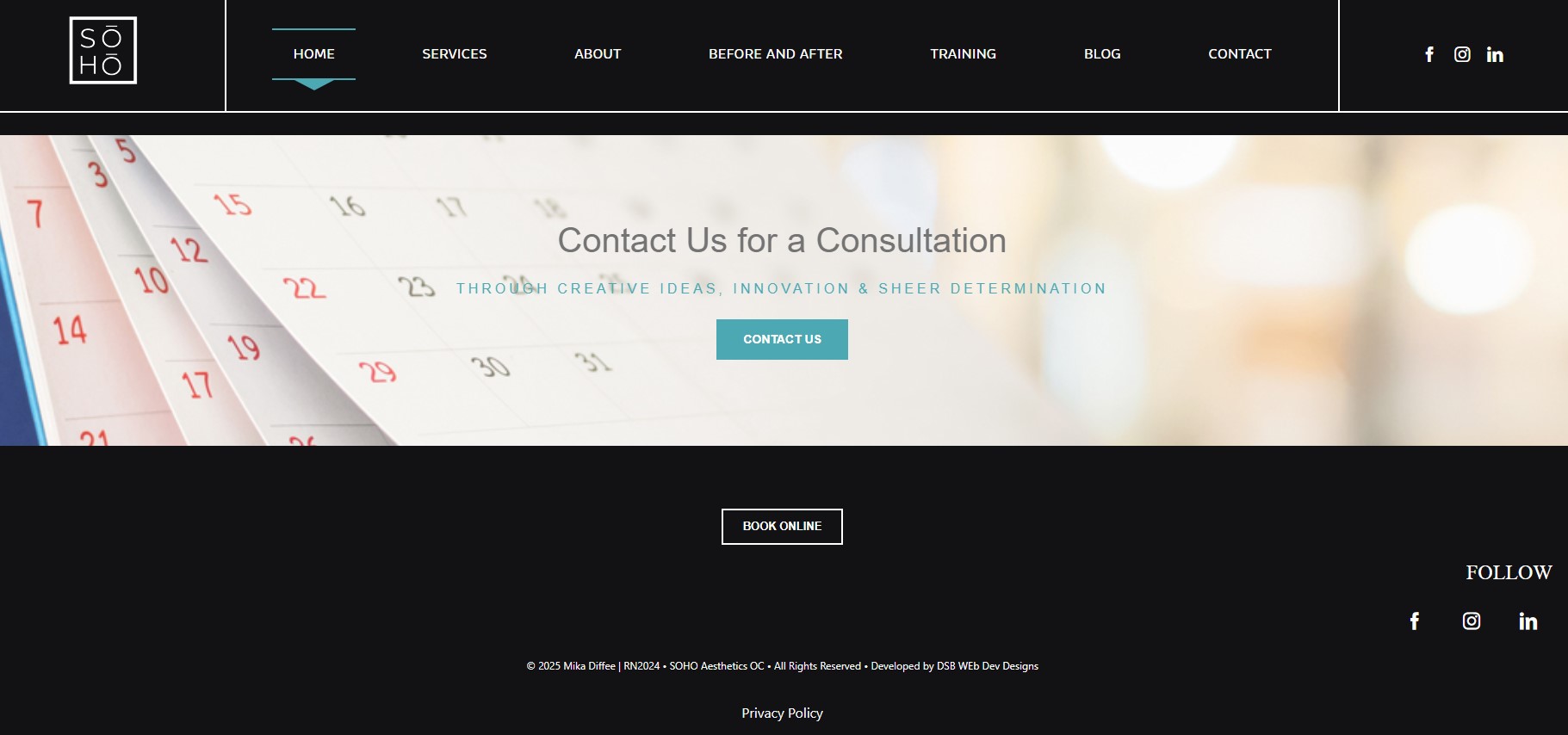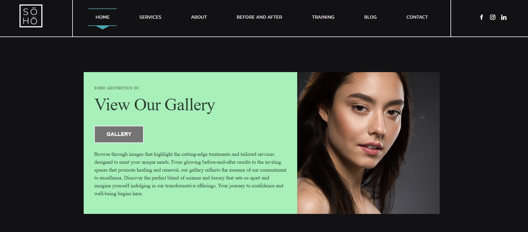 Soho Aesthetics OC is a premier beauty and holistic wellness medical spa. As the leading authority in cosmetic injectables, advanced laser therapies, and body contouring, our skilled practitioners are dedicated to enhancing your appearance and overall well-being. The website includes a Home page, Services page, About page, Before and After page, Blog, and Contact Form. It also features a button that redirects to a booking form.